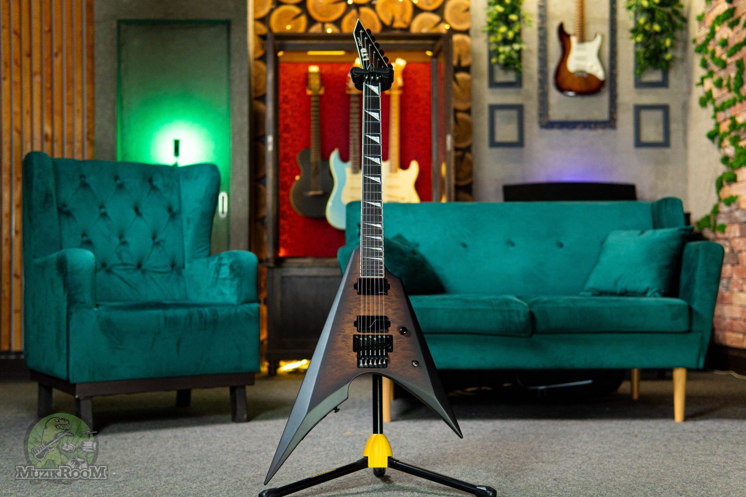 ESP LTD Arrow QM в отделке Dark Brown Burst имеет V-образный корпус из красного дерева с топом из стеганного клена. Гриф с супертонким профилем Extra Thin «U» состоит из трёх частей клёна и соединён с декой сквозным креплением. Накладка из чёрного дерева обладает составным радиусом 11,81-15,75 дюймов, универсальной мензурой 25,5 дюймов и 24 большими ладами из нержавеющей стали.